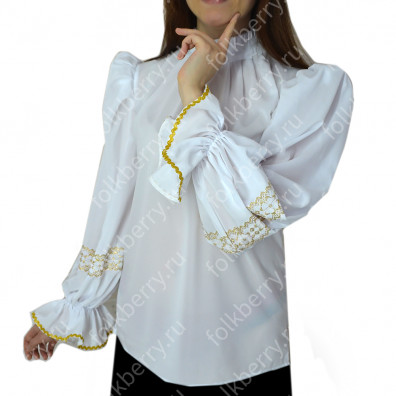 Блуза выполнена из белого шифона. Пышный рукав, по запястью волан. Декор золотистого или серебристого цвета.Для правильного размера напишите, пож-та, Ваш рост, окружность груди, ширину плеча и длину рукава.
