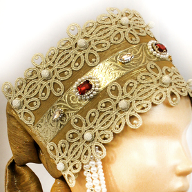 Кокошник выполнен из бархата (или атласа, на Ваш выбор), бусин белого и золотого цвета, пайеток, жаккардовой тесьмы, контрастной по цвету к фону.