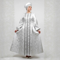 Костюм выполнен из парчи бело-серебристого цвета. Костюм декорирован искусственным мехом белого цвета. Застежка - потайные кнопки. Силуэт - приталенный, сзади кулиска для регулировки талии. Красивый пышный рукав. Отделка - серебристая ажурная тесьма. Длина шубки по спинке 93-98 см (от седьмого шейного позвонка до низа изделия).