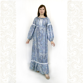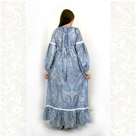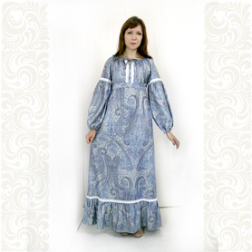 Декор платья - жаккардовая тесьма со славянскими символами. Талия немного завышена, пояс в комплекте.