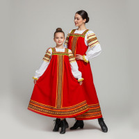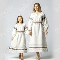 Эта традиционная женская рубаха ( длинная туника с поликами под мышками, с разрезами по бокам, с поясом) из белого льна декорирована по низу рукава, подолу и на груди широкой жаккардовой тесьмой со славянскими обережными символами красного цвета на белом фоне.