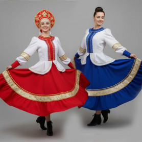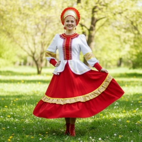 Выполненный в православном стиле сарафан с блузой «Русь» сшит из натурального хлопка в цветочек. Модель скромно декорирована однотонным воланом в цвет с основной тканью и тесьмой вьюнок. Можно носить под пояс и регулировать бретели по длине. Белая блузка из хлопка с длинным рукавом расшита натуральным нежным кружевом.