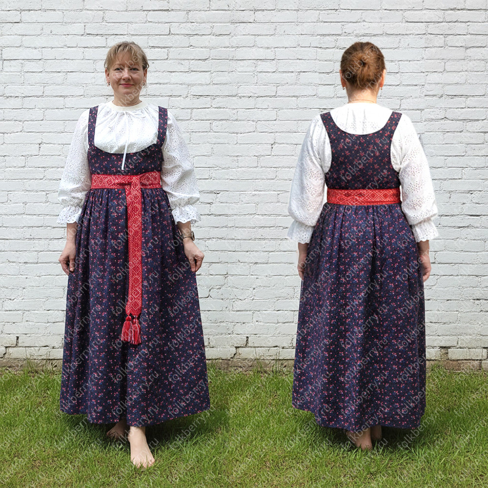 Сарафан состоит из лифа и пышной отрезной юбки, со сборкой по талии. Общая ширина сарафана по низу 3 метра. Застежка на пуговки спереди. С внутренней стороны внизу сарафана есть подбой из плотной ткани.