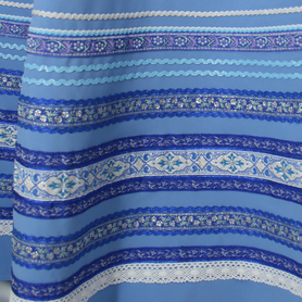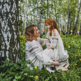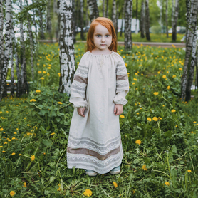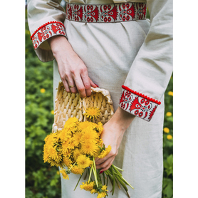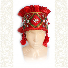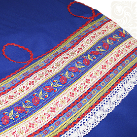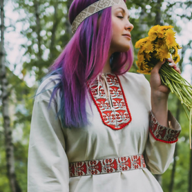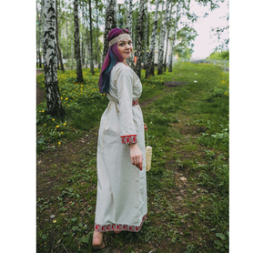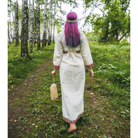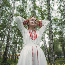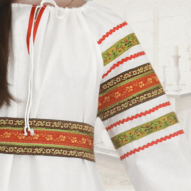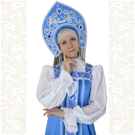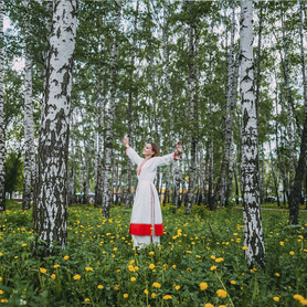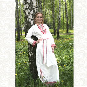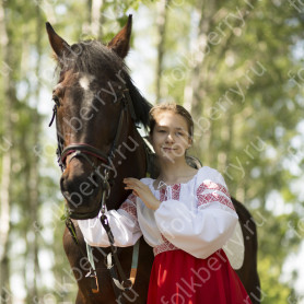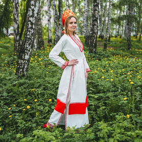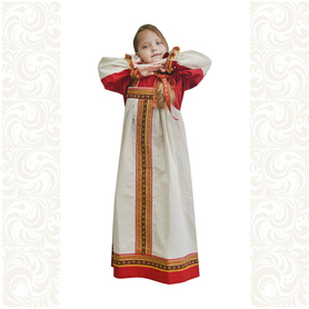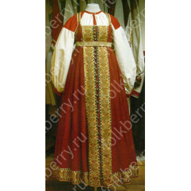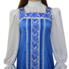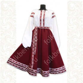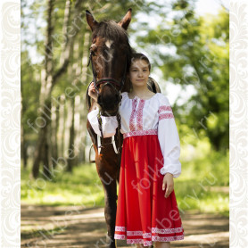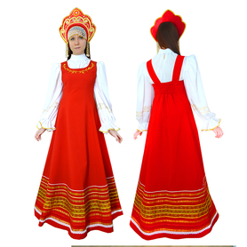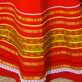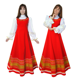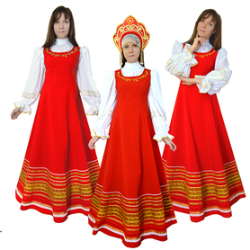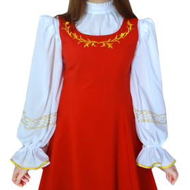 Декор по мотивам рисунков знаменитого художника 19 века Ивана Билибина. Цвет сарафана - насыщенный благородный красный, перекликается с цветом декора.