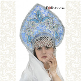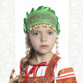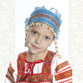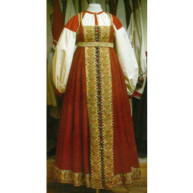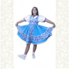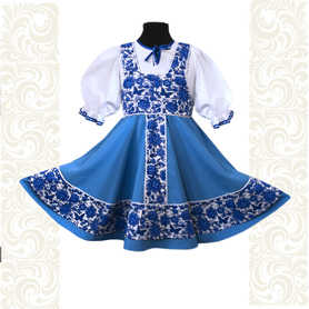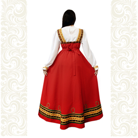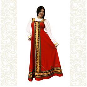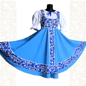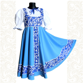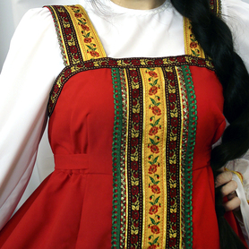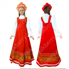 Сарафан состоит из кокетки спереди и сзади; бретелей, которые можно регулировать по длине; юбки-солнце средней длины с пышной оборкой. Сарафан выполнен из ткани габардин и украшен жаккардовой тесьмой, вьюнчиком.