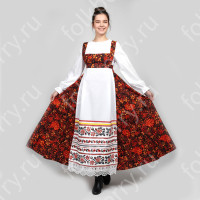 Костюм выполнен из габардина и красиво подобранного декора в золотистых цветах. Достоинства габардина в том, что он не мнется, не блестит, как атлас, ложится красивыми мягкими складками, цвет не выгорает. Юбка с оборкой, декор в золотистых цветах, по талии на двойной резинке. Блуза белого праздничного цвета, с баской, рукава расширены внизу, с манжетами. Сзади на блузе шнуровка. Она дает хорошую посадку по фигуре. Костюм предназначен для творческих сольных и коллективных театральных выступлений.